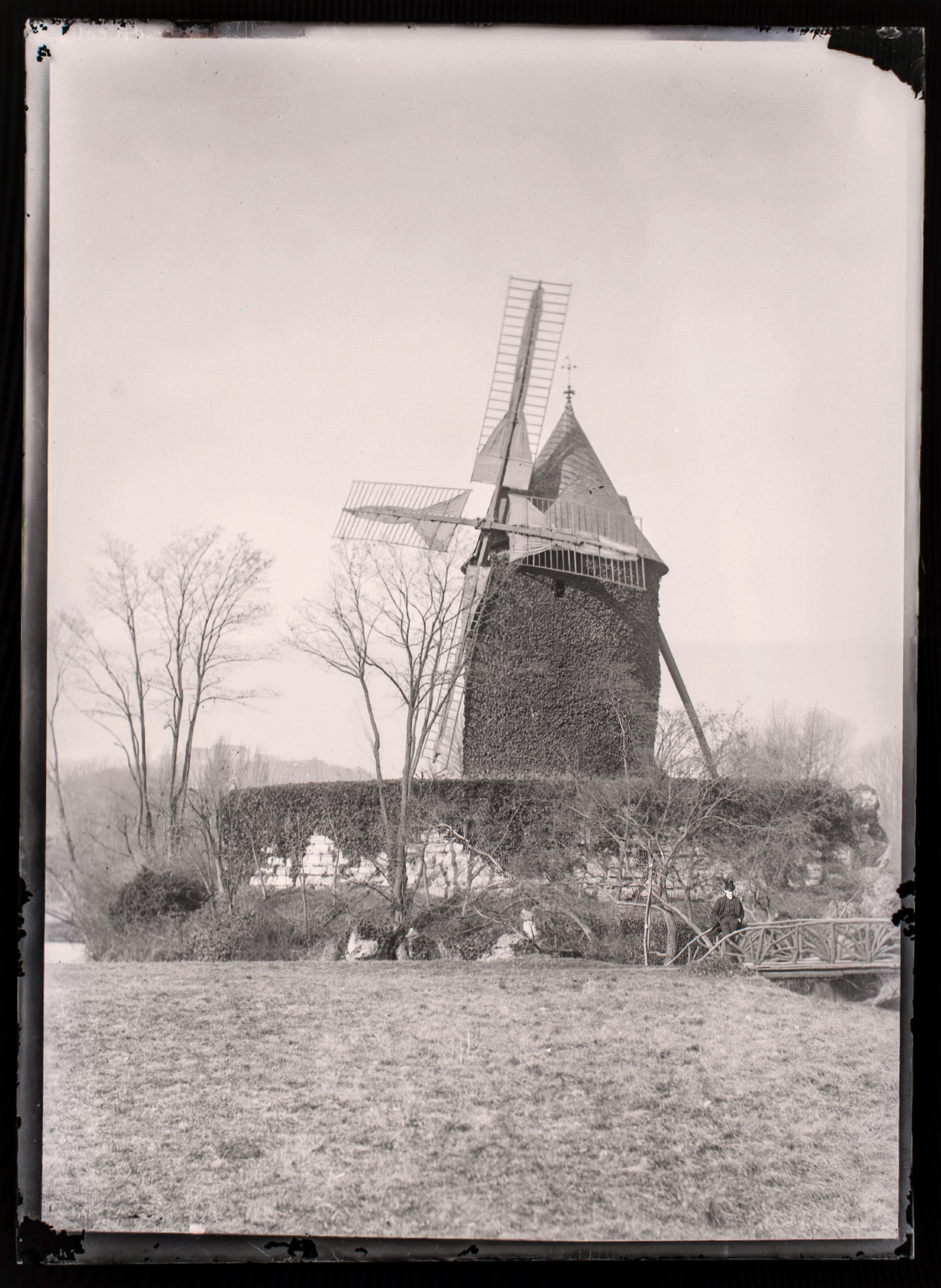 Landmark of the Outing: The ivy‑clad Moulin de Longchamp rises above its rustic bridge in the Bois de Boulogne. -