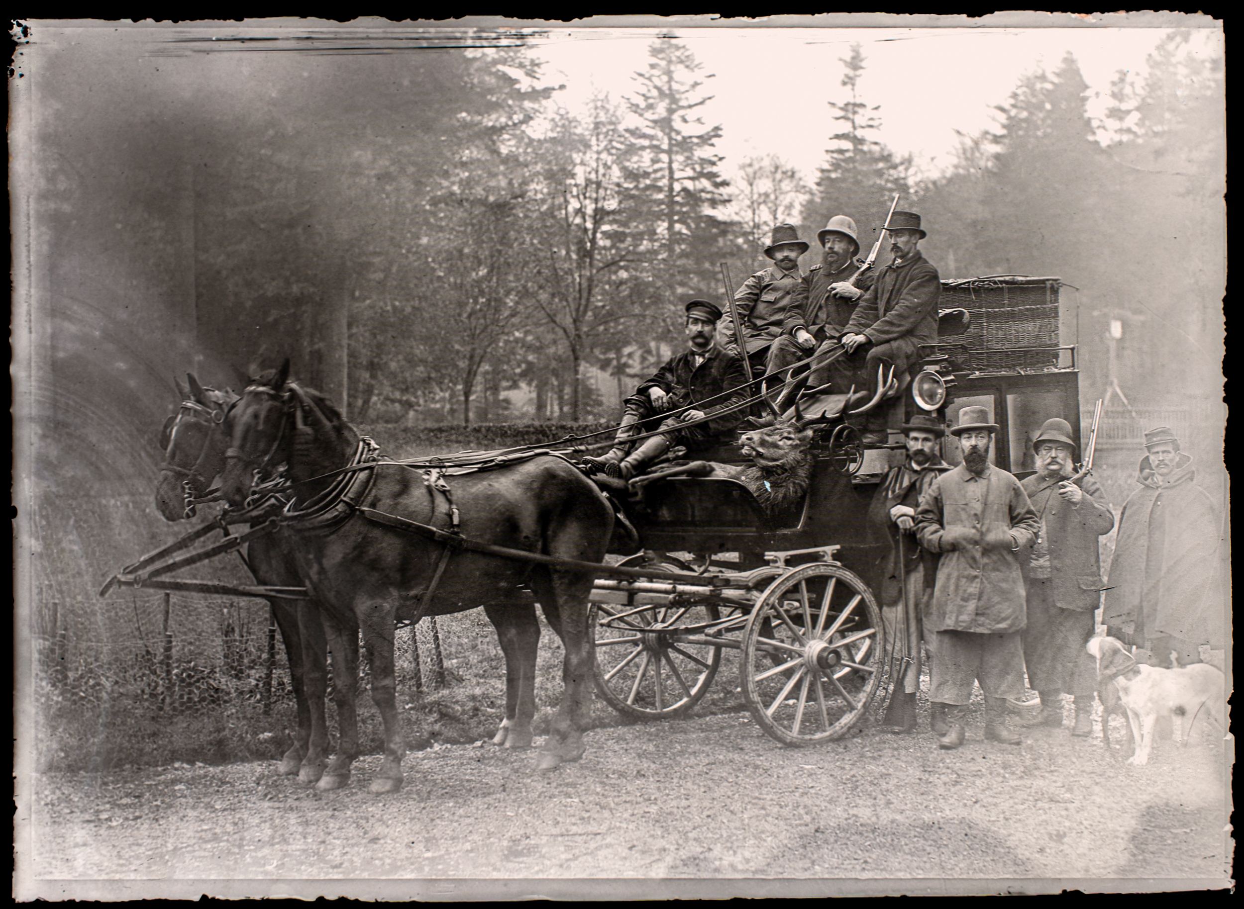 Set of seven gelatin dry plates, each 13 × 18 cm, depicting a late 19th century hunt in the Versailles region. The images follow the sequence of the day, from arrival at the Porte de Jouy gatehouse and pauses in the forest rides to the trophy portrait of a stag, the party’s return in a carriage, and views of the Moulin de Longchamp. All participants are armed with pinfire sporting guns, typical of the period.