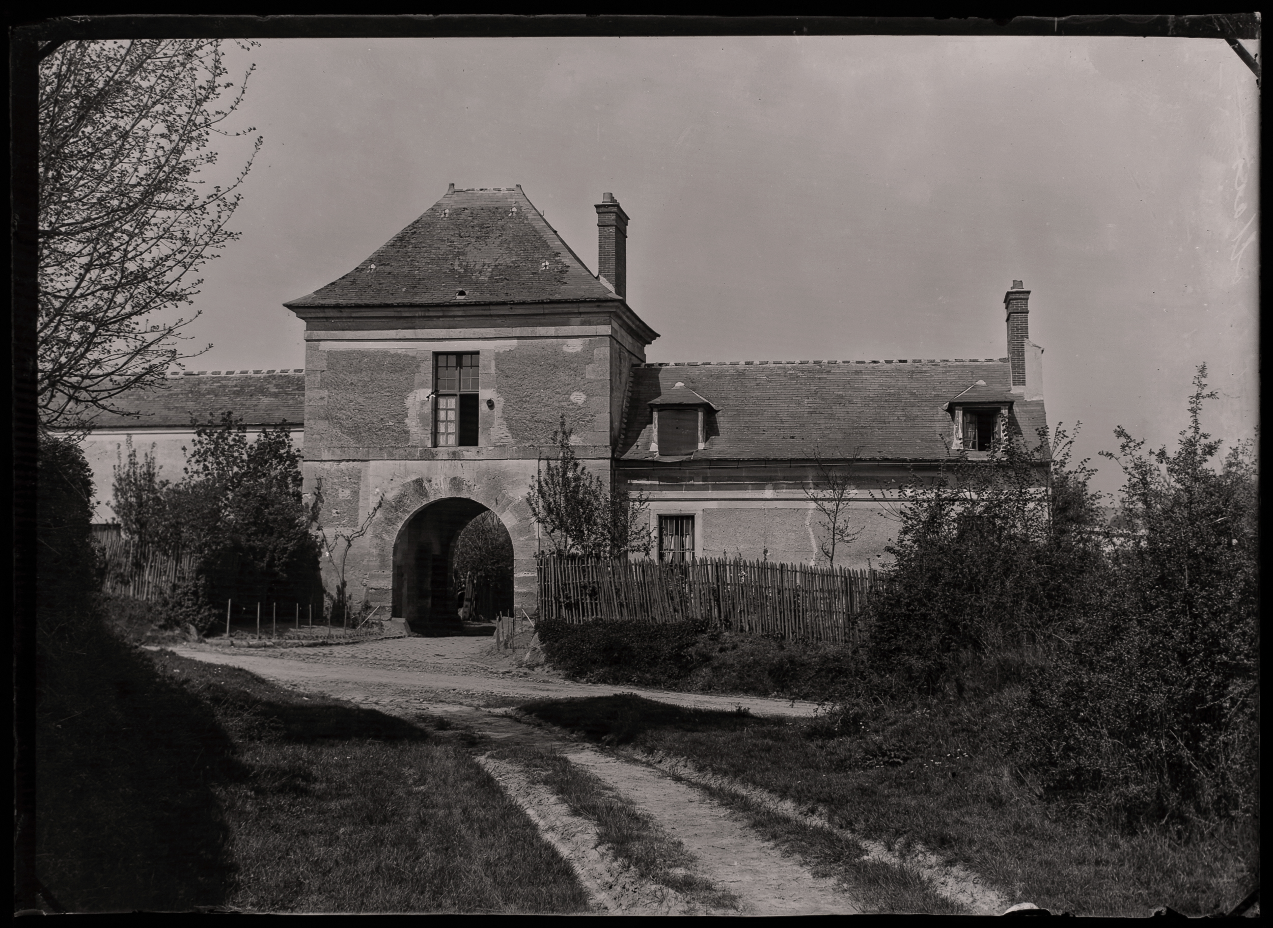 This series of seven glass plate negatives presents a complete narrative of a hunt undertaken in the wooded landscape around Versailles, dating from the 1880s to 1900s. The photographs begin at the Porte de Jouy in Les Loges-en-Josas, a historic stone gateway that controlled entry to the royal hunting domain. To be pictured there with firearms indicates privileged access to grounds once reserved for royal and invited hunts.