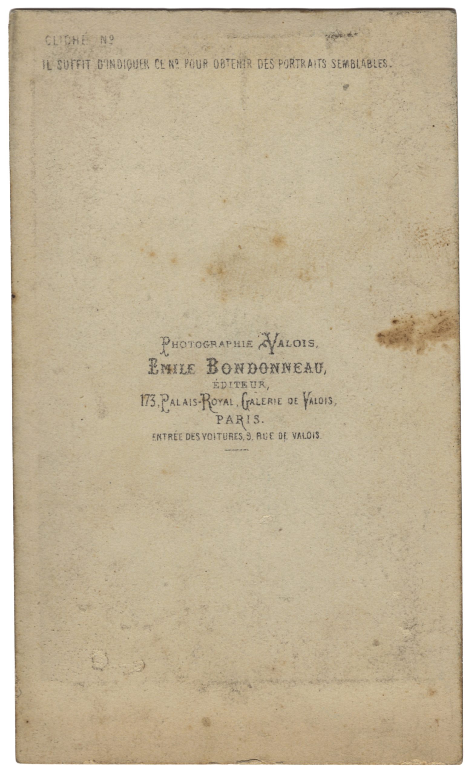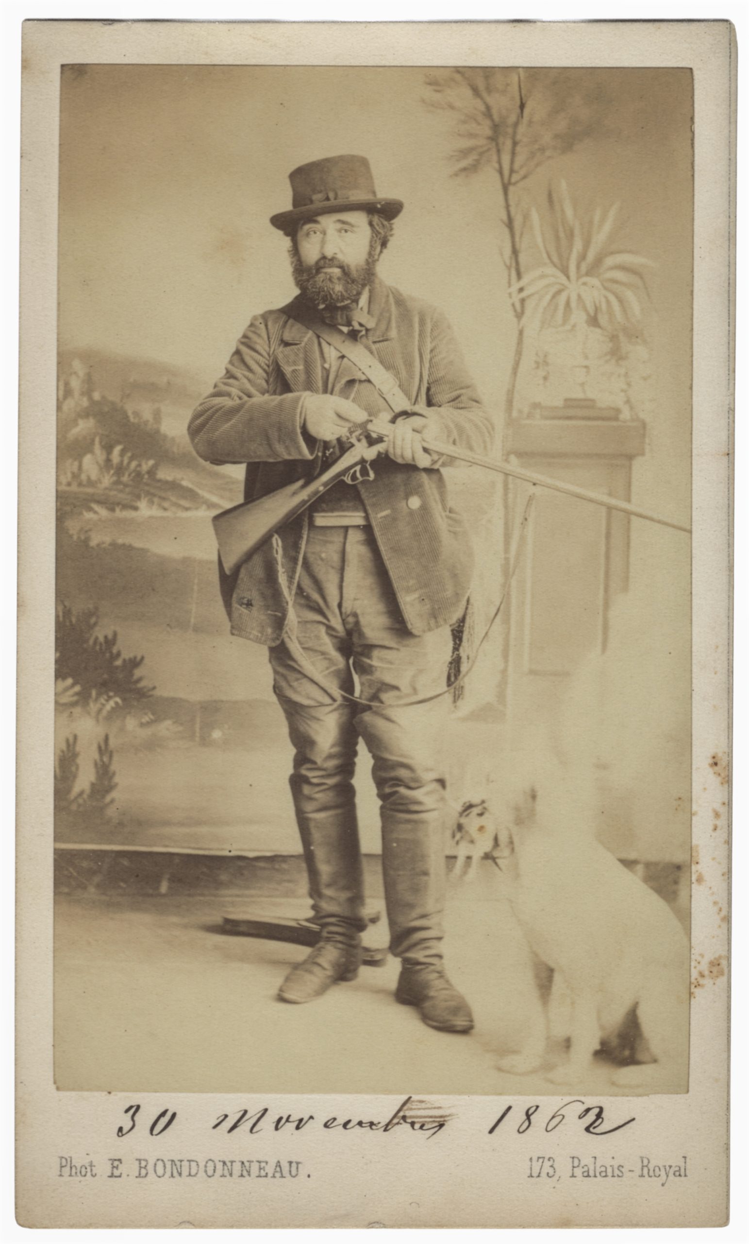 This dated 1862 studio portrait by Emile Bondonneau of the Palais Royal captures a bearded Parisian hunter standing with a pinfire shotgun held across his body. His clothing reflects practical French sporting dress of the early 1860s: a corduroy jacket, a waistcoat, and sturdy trousers tucked into tall leather gaiters suited for rough ground. He wears a felt hat with a broad, softened crown, adding a touch of urban character to an otherwise rural ensemble. A dog sits at his side, its patient posture typical of the loyal companion often included in hunting portraits of the era.